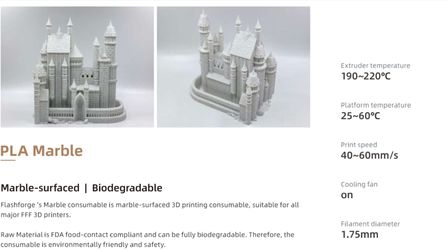 Designed and manufactured by Flashforge. Flashforge PLA Marble has a spotted marble-like effect, which makes it great for architectural models and decorative items.Made of high-quality PLA material to ensure even supply and extrusion.