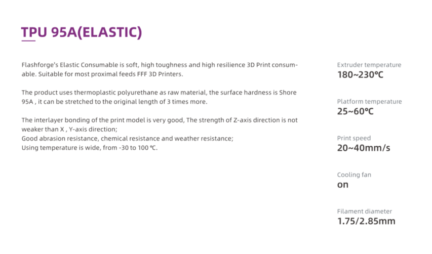 The Flashforge 1.75 mm Elastic filaments work incredibly well with any 3D printer that takes 1.75 mm filament. This filament is incredibly elastic, meaning that not only will it flex back and forth, but it will also stretch incredibly far, giving it incredibly unique properties in 3D printing. This works well in specific engineering projects, along with more experimental work, such as fashion or interactive art pieces.