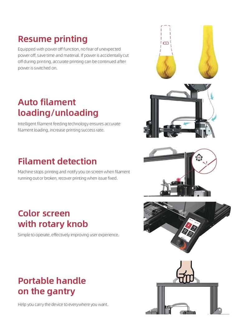The newly added filament detection sensor helps maximize print success & avoids filament waste, while the revised vertical command panel better conforms to user operation habits and convenience of use.