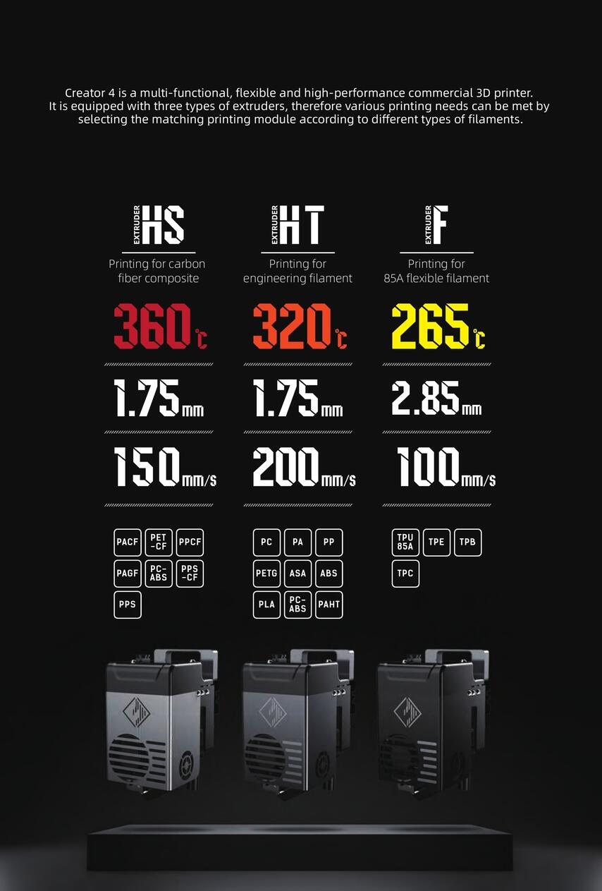 | Filament | TPU85A / TPE / TPB / TPC | PLA / PETG / PC-ABS / PAHT / ABS /ASA / PP / PA / PC | PACF / PET-CF / PP-CF / PA-GF / PC-ABS / PP-GF / PPS-CF / PPS |