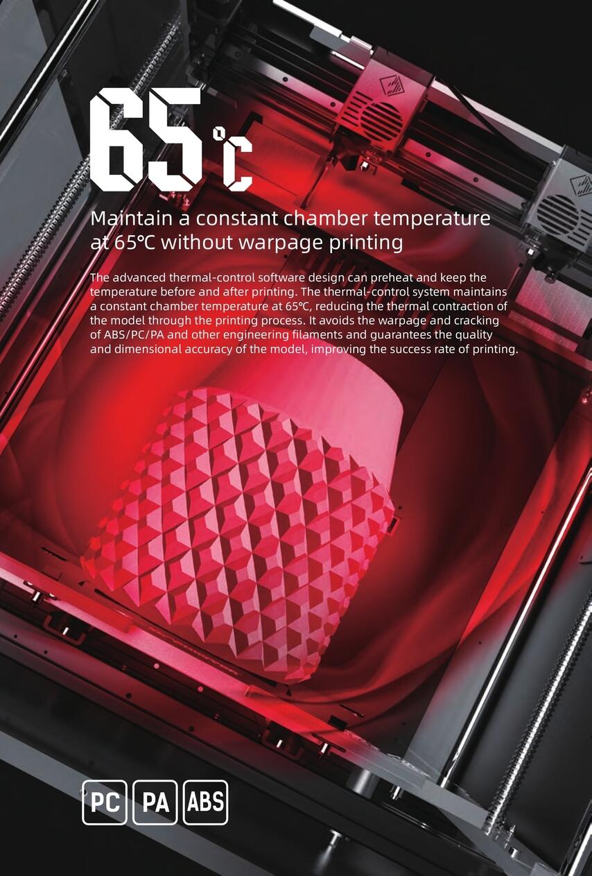 Creator 4 har et termisk kontrol system, der kan holde en konstant temperatur i printkammeret op til 65°C, hviket mindsker sammentrækning og revner på jeres printede modeller.