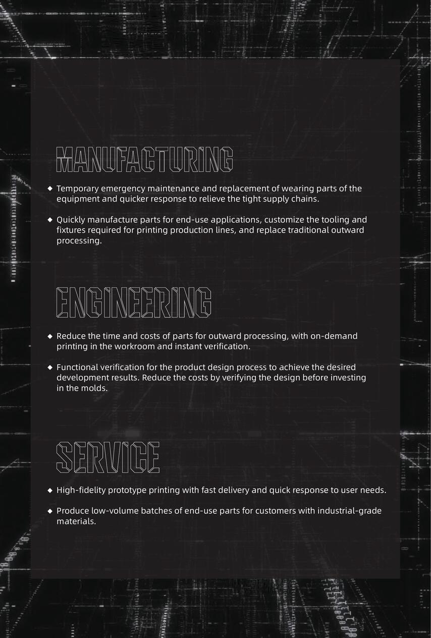The advanced thermal-control system of Creator 4 keeps the print chamber at 65℃, which effectively reduces model shrinkage, warping at corners, and furnish breakage. Creator 4 ensures good printout quality, good printing precision and improves print success rate a lot.