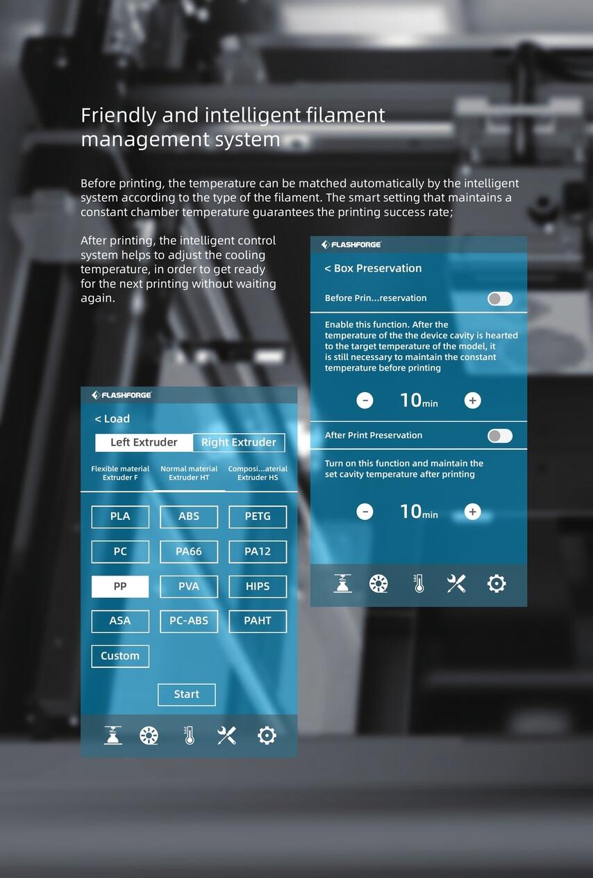 Different filaments can be automatically adjusted to different preheating temperatures in the chamber, achieving higher success rate of printing. When finishing printing, the chamber temperature can be adjusted automatically for model cooling down. Quite friendly system design for next print!